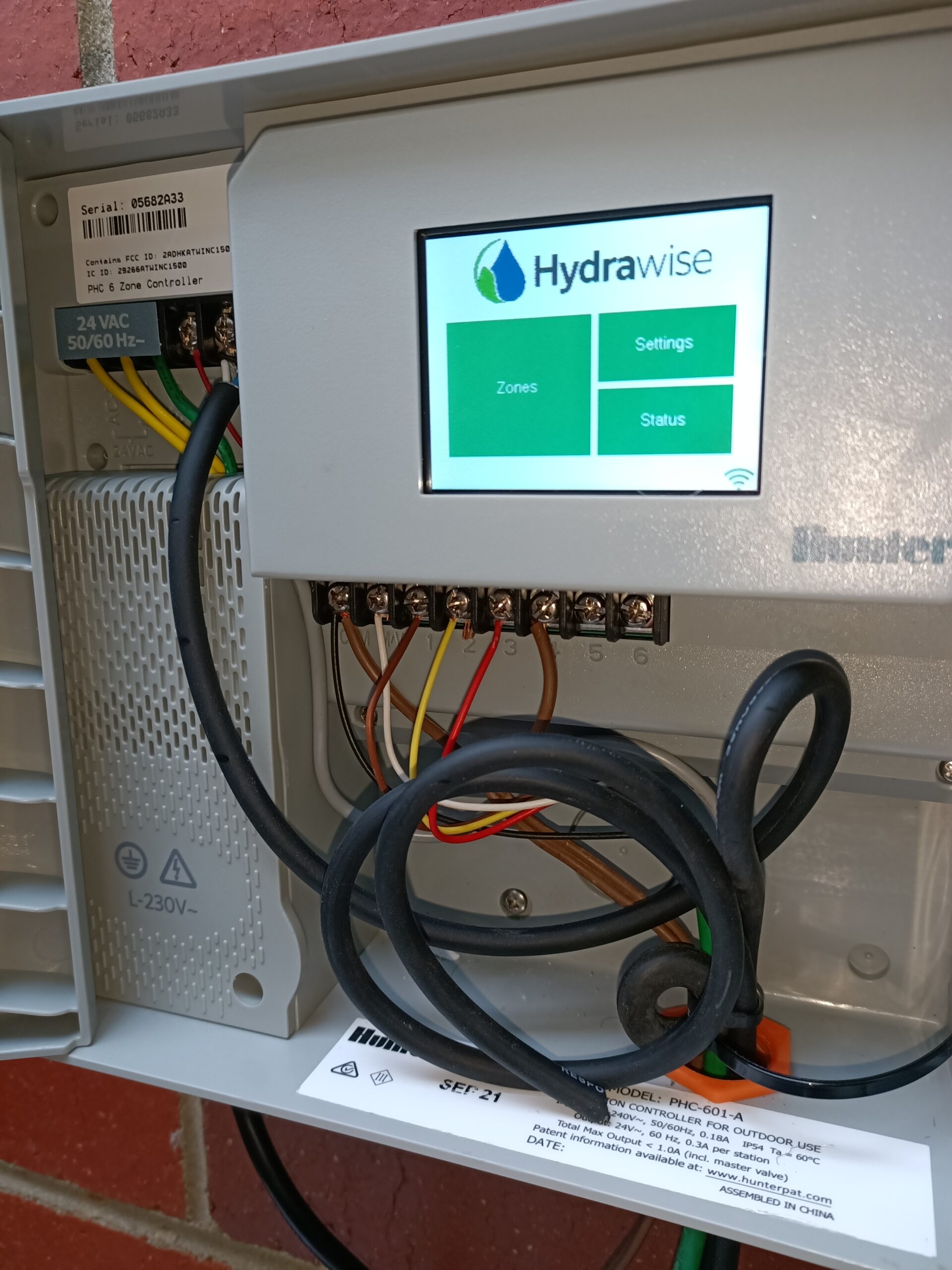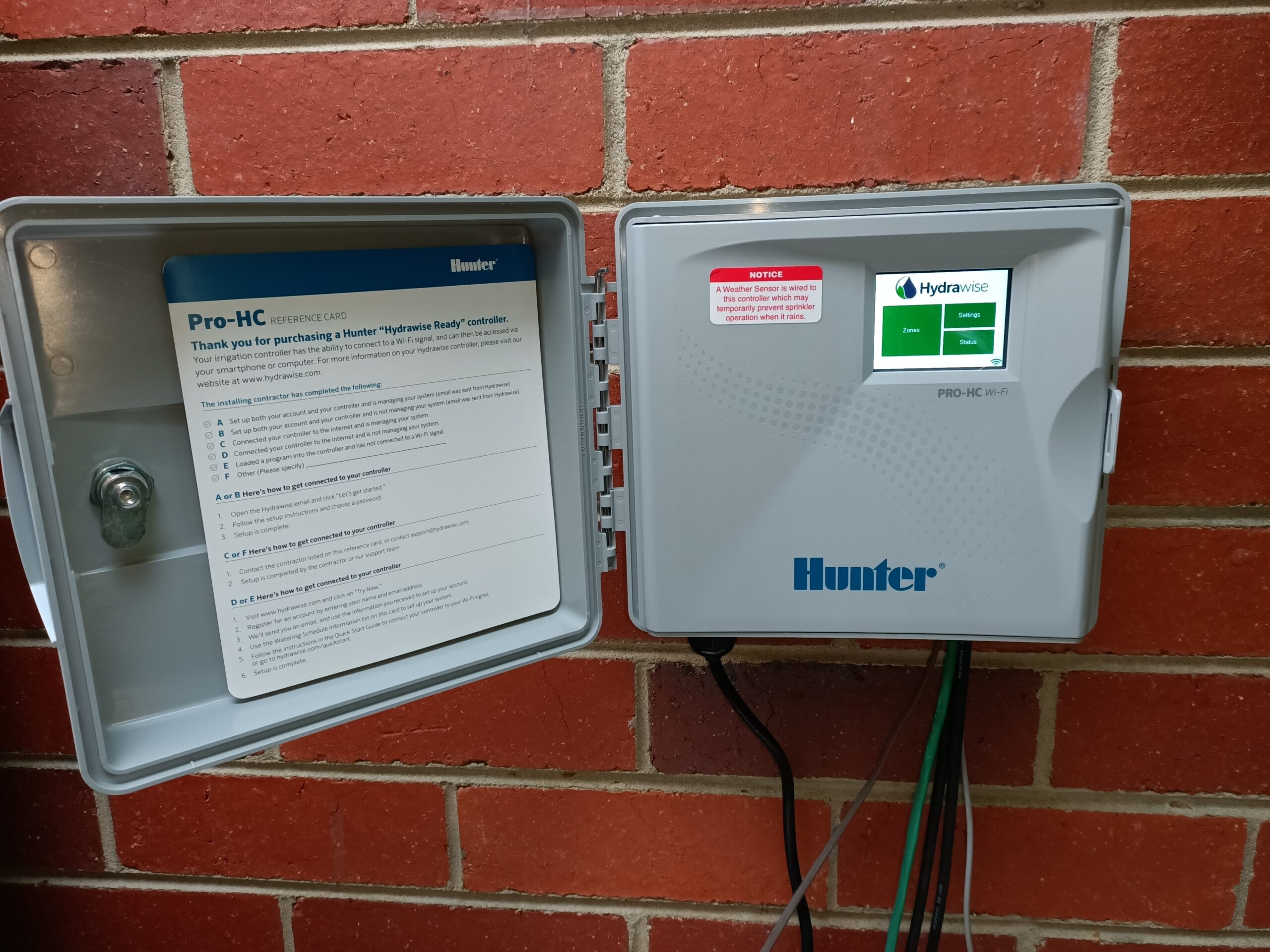 - A four zone drip irrigation system connected to a Hunter Pro HC WiFi controller and flow meter. This system includes predictive watering, mobile app control, and most importantly, leak detection.
