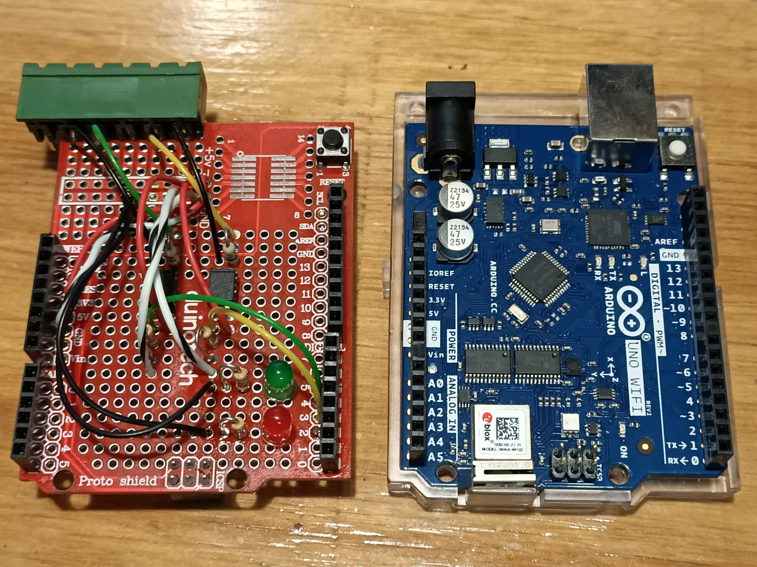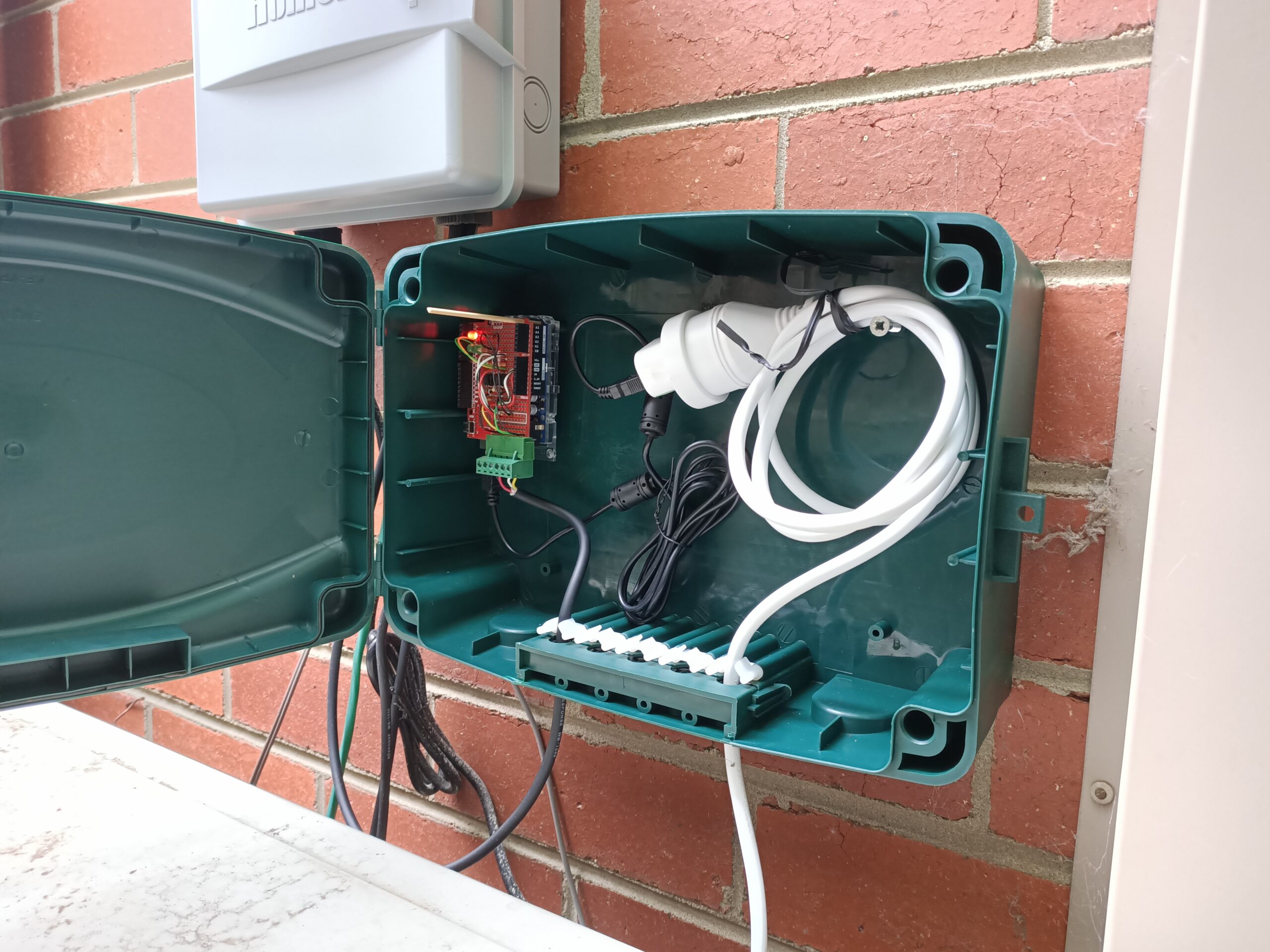 Is actually a microcomputer (Arduino Uno Wifi). The flow meter provides a ‘pulse’ for every litre of water it passes, pumped (rain) water is indicated by the presence of 5VCD from a USB power supply plugged into the pump controller.